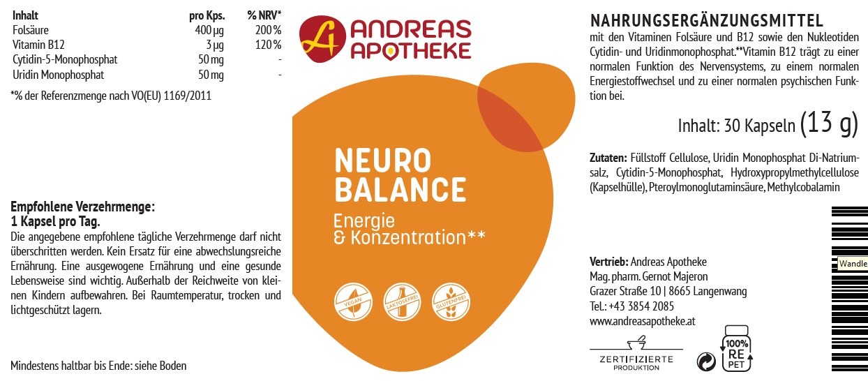 Zutaten: Füllstoff Cellulose, Uridin Monophosphat Di-Natriumsalz, Cytidin-5-Monophosphat, Hydroxypropylmethylcellulose (Kapselhülle), Pteroylmonoglutaminsäure, Methylcobalamin